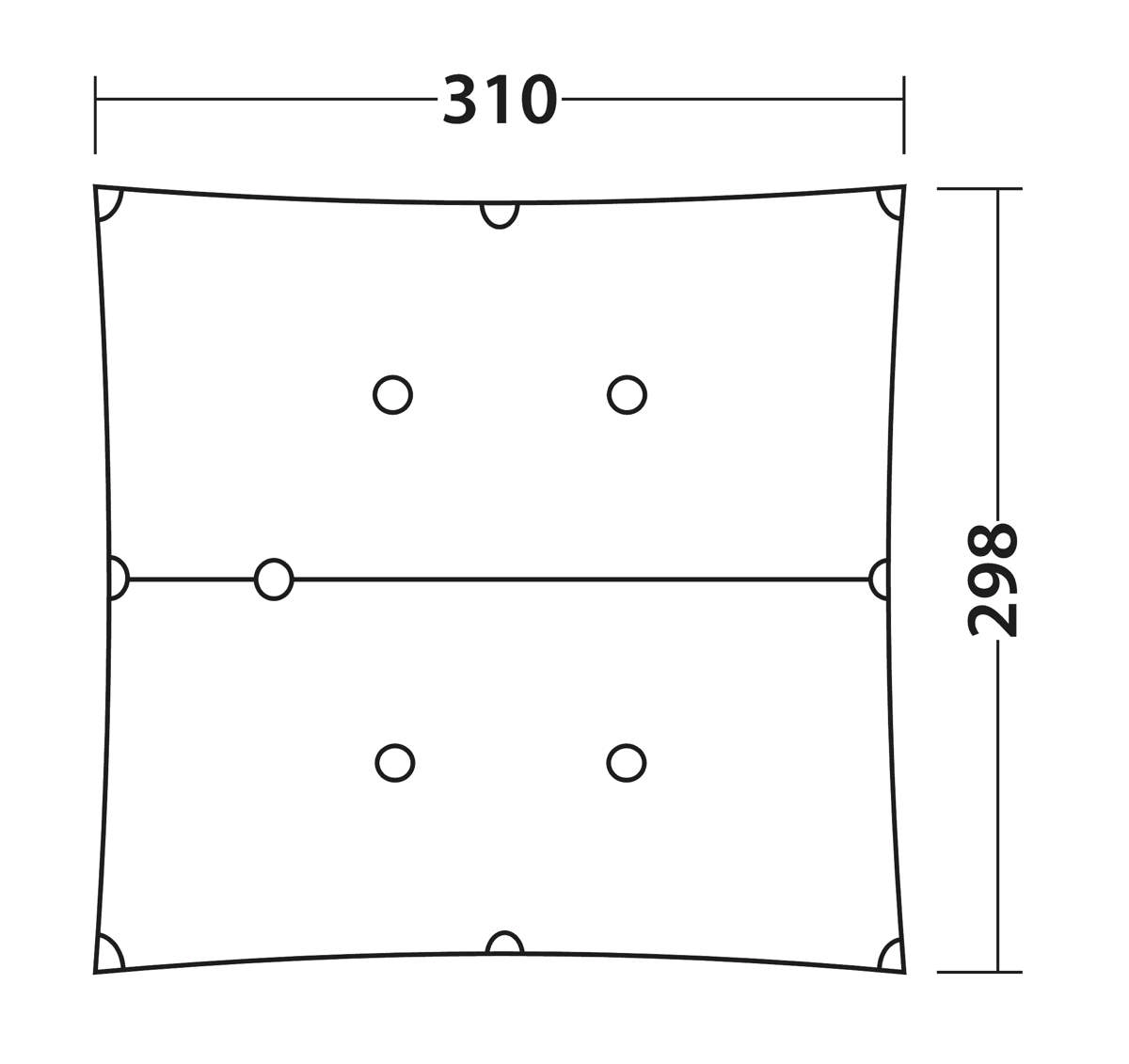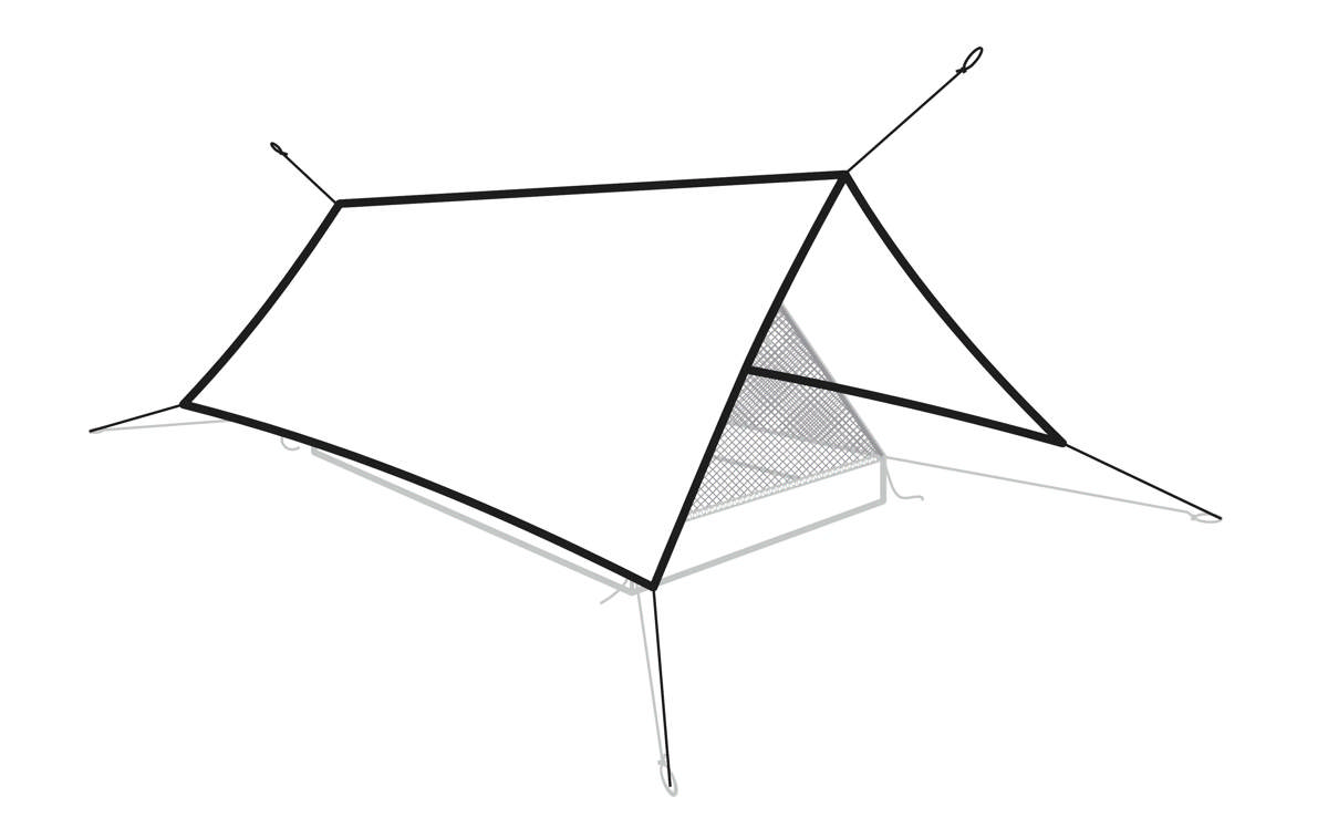 Zwei-Personen-Tarp, das für eine schnelle Montage mit einem nicht durchhängenden HydroTex SilPoly RS UL Außenzelt von 2000 mm Wassersäule konzipiert ist. Die gewölbten Schnittkanten und mehrere Abspannleinen bieten vielseitige Aufbaumöglichkeiten.