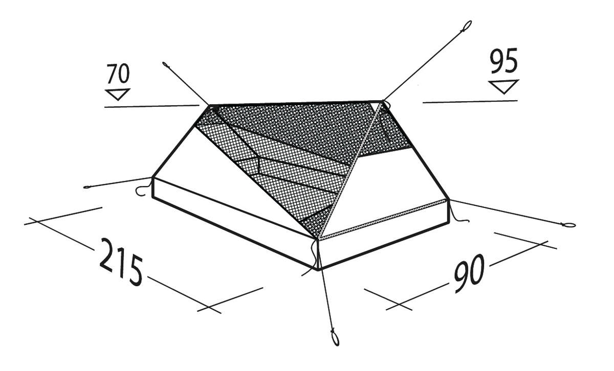 Ultralight mesh tent for one, compatible with tarps. Bathtub floor protects from splashes and wind. Ultralight 16g/m2 mesh.