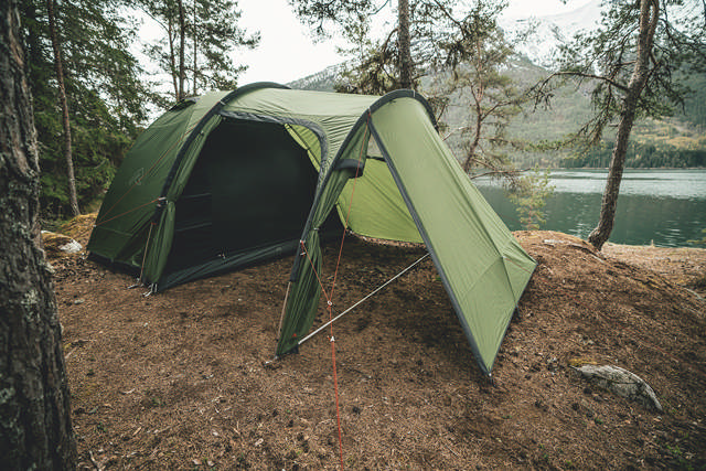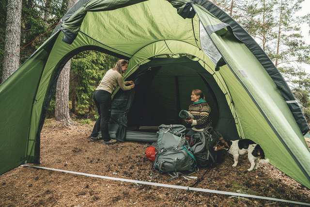 Les portes avant et arrière offrent une entrée rapide et protégée de la pluie, tandis que la possibilité de transformer les portes en auvents à l’aide de mâts supplémentaires crée un espace extérieur abrité. Chaque modèle inclut des absides étendues pour cuisiner ou stocker l’équipement, des chambres en tissu en maille équipées de rideaux, des poches d’organisation et des arceaux en aluminium codés couleur pour un montage intuitif.