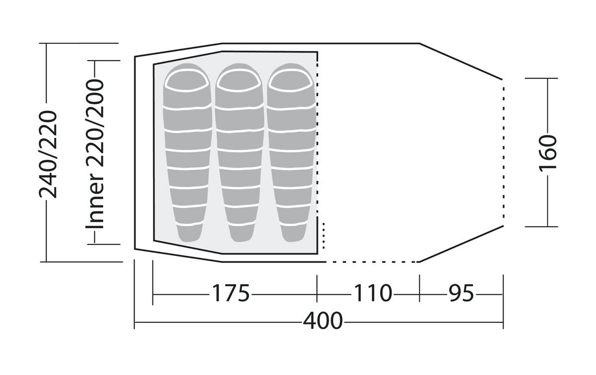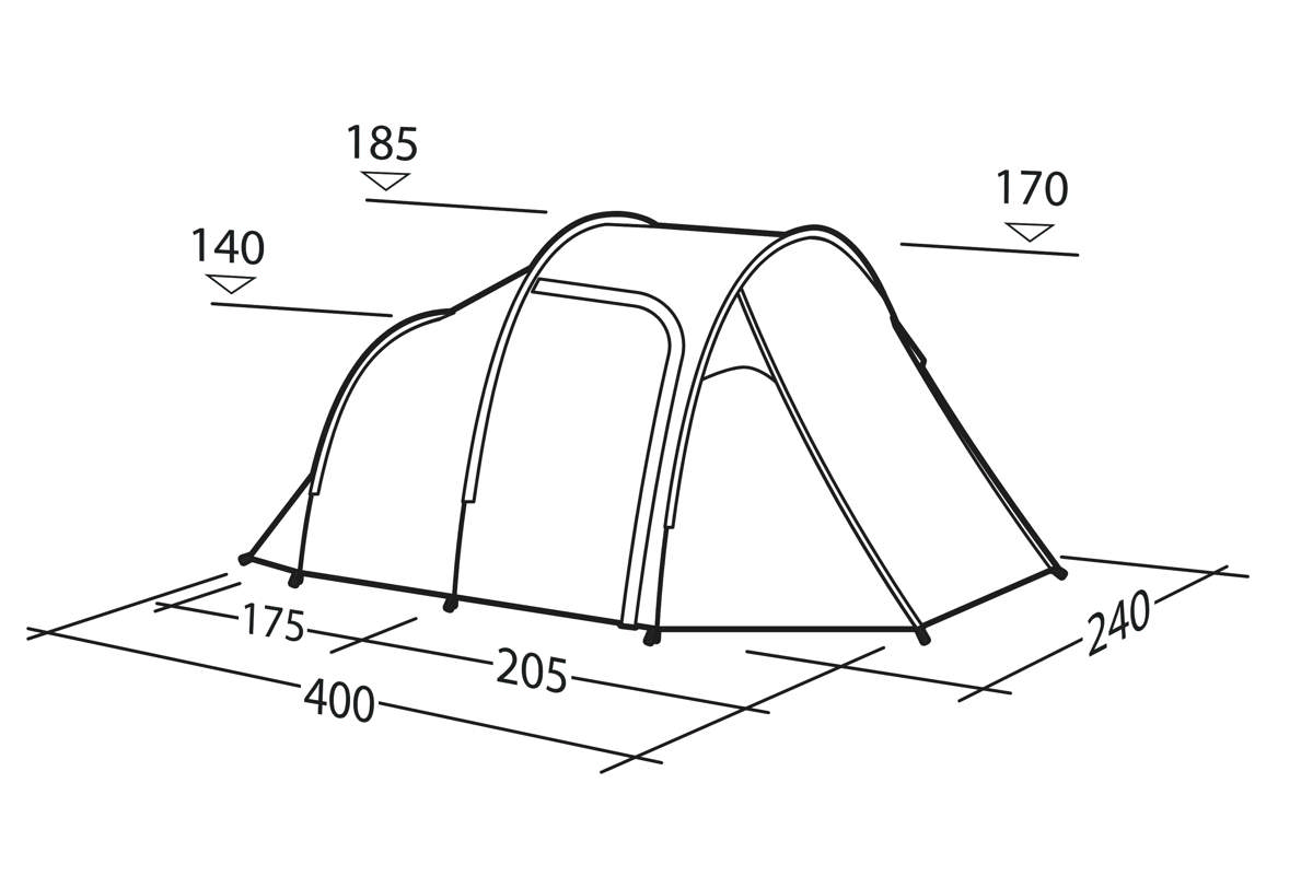 Tente tunnel spacieuse pour trois personnes avec une colonne d’eau de 4000 mm. Comprend une hauteur sous plafond debout, un porche étendu, des panneaux en maille et des options d´entrée polyvalentes.