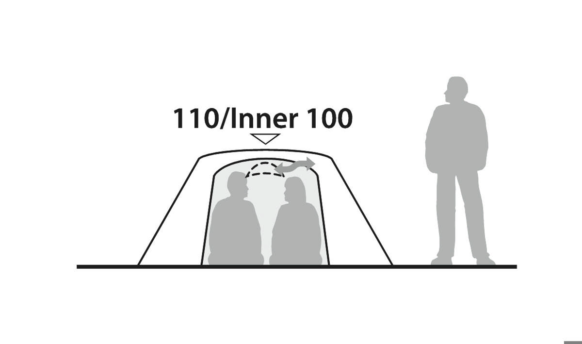 - Die Kombination aus Kuppelkonstruktion und kurzer, querlaufender Firststange bietet flexibel nutzbaren Wohn-, Koch- und Stauraum. Dank der besonders großen Höhe und Breite im Inneren können die beiden Bewohner nebeneinander sitzen. Die zwei Eingänge bieten beiden Campern bequemen Zugang sowie diverse Möglichkeiten zum Öffnen der Eingänge, die einerseits Schutz vor Wind bieten und andererseits für Durchlüftung sorgen. Die fest verankerten Stangenenden und die Doppelösen im robusten Gewebe geben dem Innengestänge sicheren Halt an der Firststange.