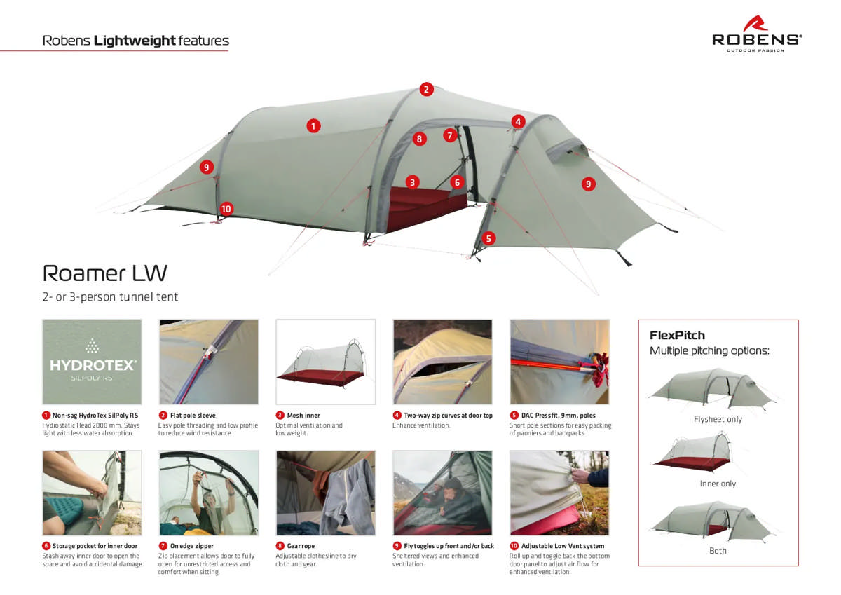 - The Robens Roamer 2 LW versatile tunnel tent accommodates up to two people and features a flexible pitching system, allowing you to set it up as a flysheet only, inner only, or a complete shelter. Crafted from no-sag HydroTex SilPoly RS with a 2000 mm flysheet and featuring a best-in-class 5000 mm hydrostatic-head floor, it delivers both lightweight packability and uncompromising weatherproofing. HydroTex SilPoly absorbs significantly less water than nylon, so it stays lighter even in wet conditions. It also dries quickly and remains tight, strong, and non-sagging when exposed to moisture, delivering consistent performance. A mesh inner promotes optimal ventilation while panels secures effective protection from wind and dust. Practical features like fly toggles at the front and back enhance airflow and provide sheltered views. Short pole sections enable easy packing alongside your gear, and the adjustable Low Vent system adds further convenience. The tent uses DAC Pressfit 9 mm poles, known for their excellent strength, reliability, and low weight. The porch allows for sheltered cooking while sitting in the inner tent or simply for storage. Reflective trims facilitate quick location at night.