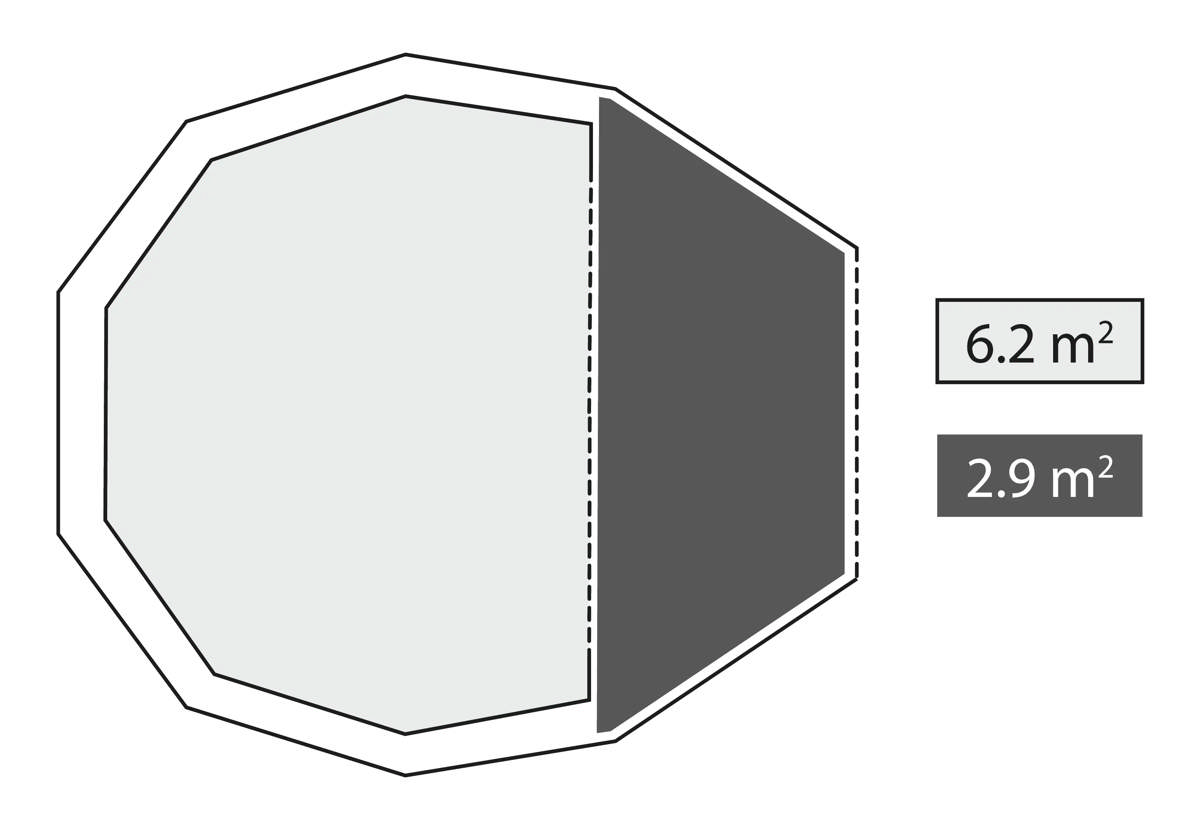 - Le mât central décalé diffère des modèles traditionnels et améliore l´espace et le confort de la tente intérieure.